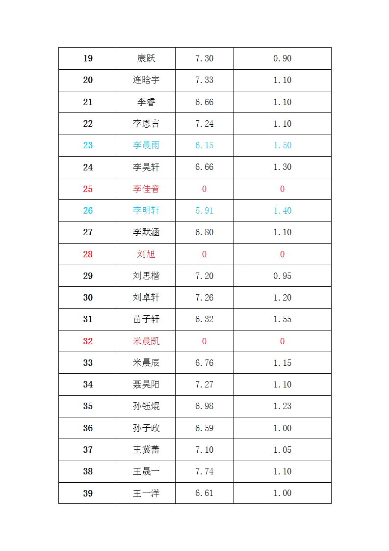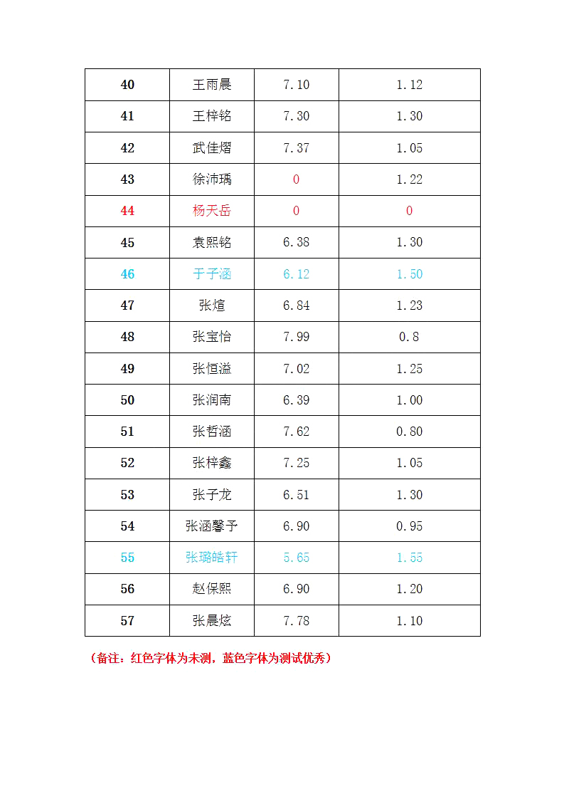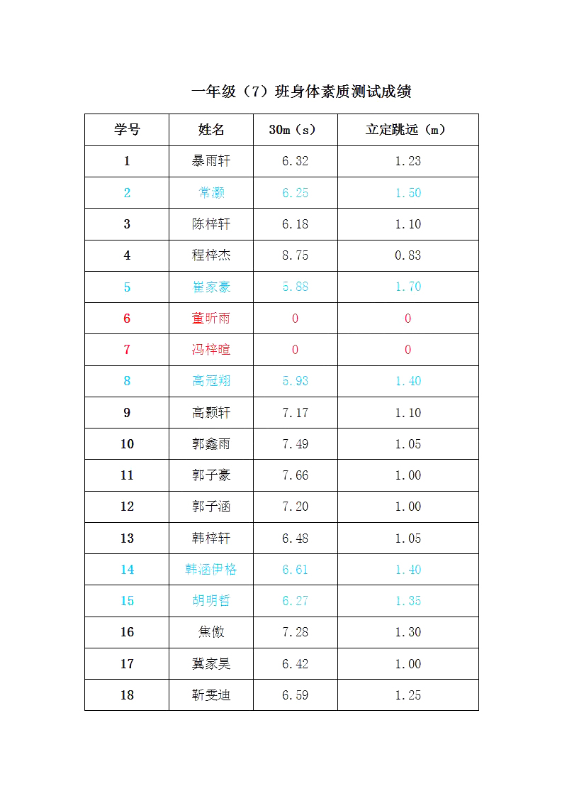 百花小学一年级(7)班身体素质测试成绩